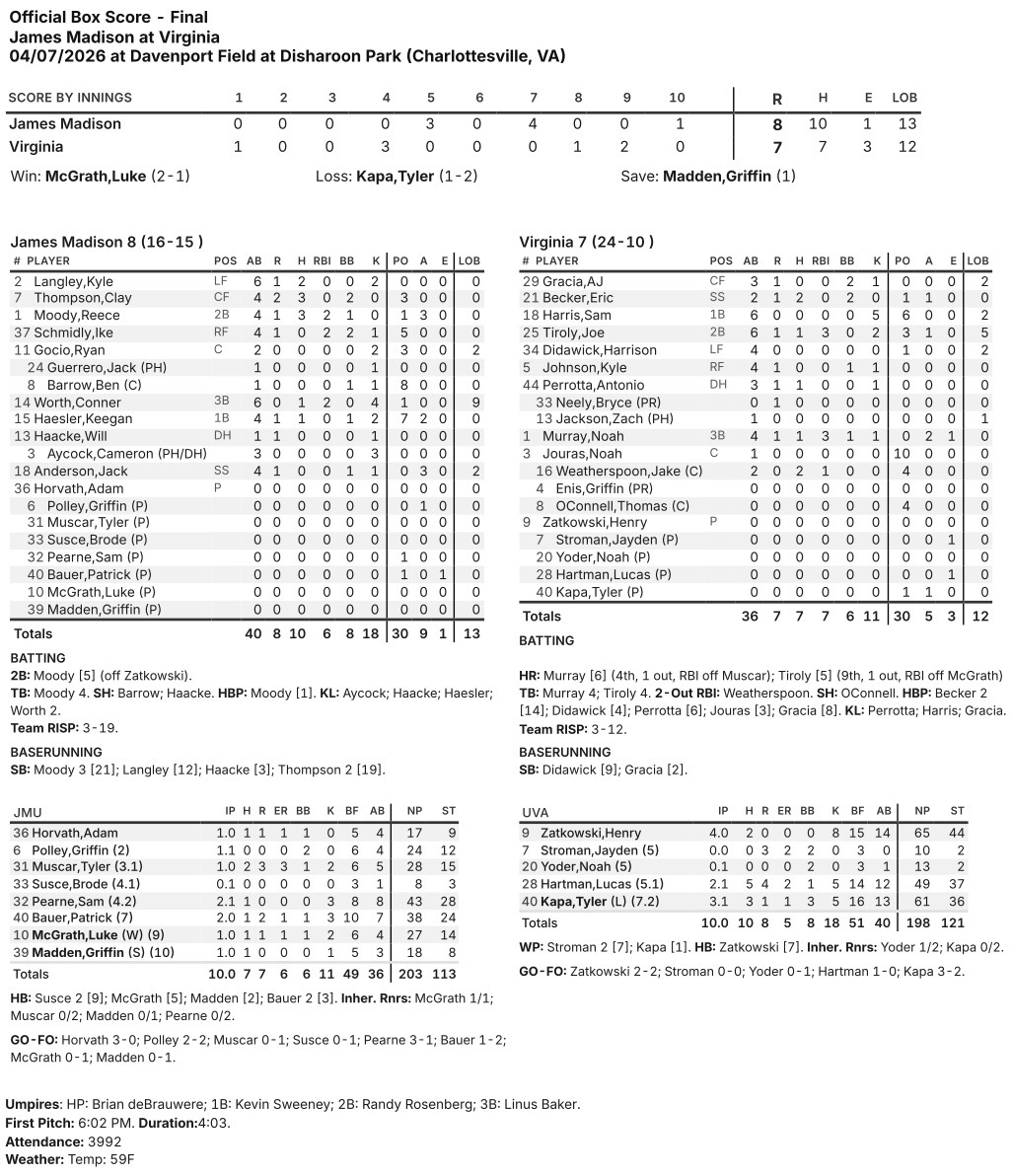 James Madison plated four runs in the seventh and took a 7-4 lead into the final two innings before Virginia scored one run in the eighth and two in the ninth to force extras. The Dukes’ winning run in extras was scored on a bases-loaded wild pitch.