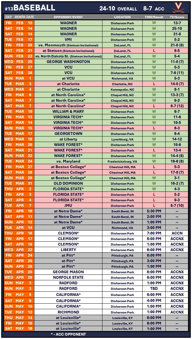 No. 13 Virginia returns to ACC play on Friday as the Cavaliers head to South Bend for a three-game weekend series with the Notre Dame Fighting Irish. Friday’s series opener is slated for a 5:30 p.m. first pitch on ACCNX and WINA (98.9 FM/1070 AM).