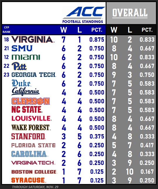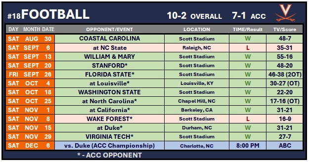 - For the first time in program history, UVA (7-1) finished the regular season in sole possession of first place in the ACC standings.