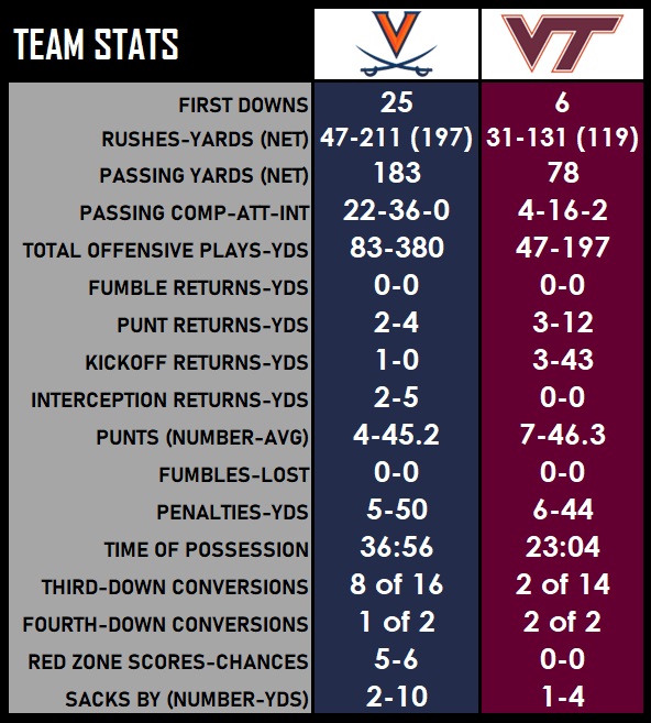 UVA racked up 25 first downs, compared to just six for the Hokies, and controlled the pigskin for 36 minutes, 56 seconds (out of 60). Tech had the ball for a total of 13:03 across the final three quarters.