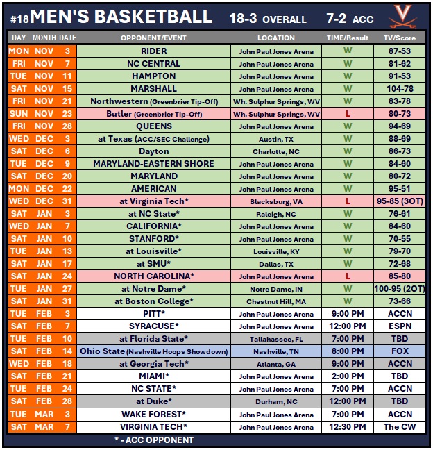 Who: No. 18 Virginia (18-3, 7-2) vs. Pitt (9-13, 2-7)