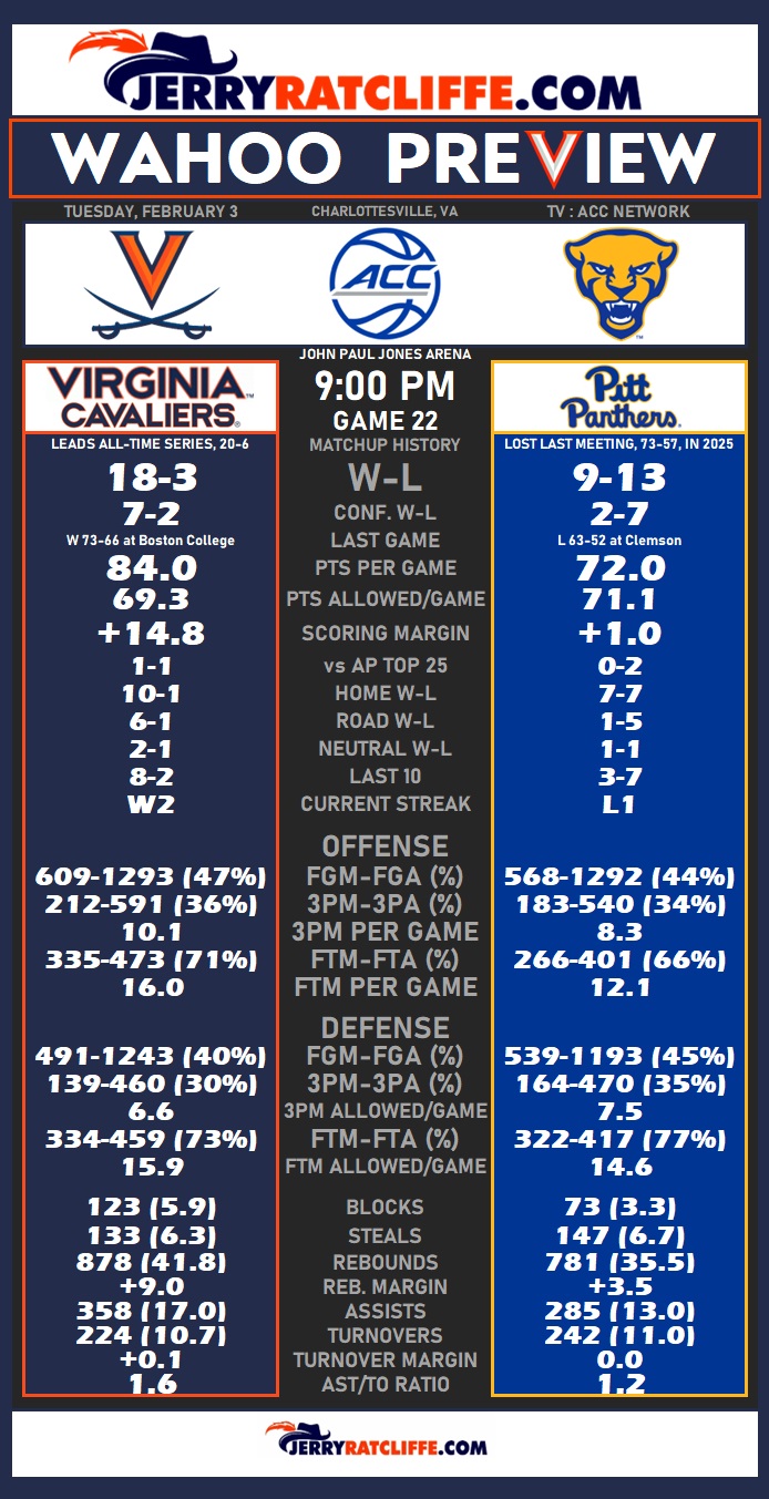The Skinny: Pitt is struggling offensively, averaging 72.05 points per game, next-to-last in the 18-team ACC. Coach Jeff Capel lost his best scorer, DeShaun Jackson, to injury early in the season. Virginia is coming off back-to-back grinders on the road, coming from 19 points behind to outlast Notre Dame in double-overtime, and holding off Boston College. Is tonight when the Wahoos get back on track and blow out an opponent, instead of having to sweat out another Thriller Diller?