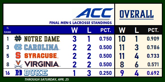 North Carolina, Syracuse and Virginia each tied for second in the ACC standings. By virtue of the league’s tiebreaker procedures, the Cavaliers earned the No. 4 seed, Syracuse the No. 3 seed and North Carolina the No. 2 seed.