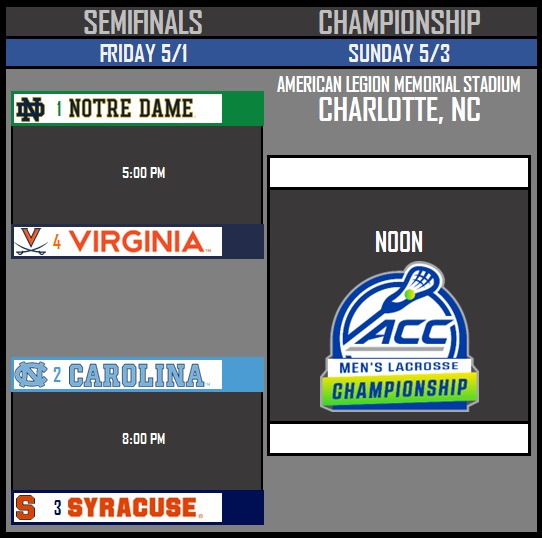 No. 4 seed Virginia, which handed No. 1 seed Notre Dame (10-1) its lone loss of the season on March 28, will face the Fighting Irish again on Friday in the semifinals of the 2026 Allstate ACC Men’s Lacrosse Championship. Opening faceoff from American Legion Memorial Stadium in Charlotte, North Carolina, is set for 5 p.m. on ACC Network.