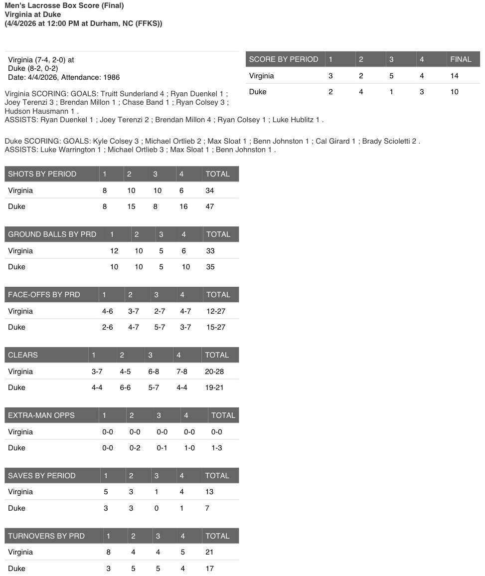 The Blue Devils, who entered Saturday’s game as the nation’s leading in scoring offense with an average of 16.89 goals per game, were held to only 10 goals. That’s Duke’s second-lowest scoring output of the season.