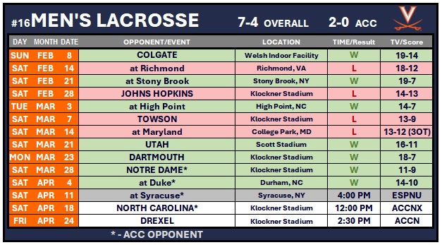 For the first time since 2004, Virginia emerged victorious in a regular-season meeting against its archnemesis in the sport of lacrosse, the Duke Blue Devils. After trailing 6-5 at the intermission, the No. 16 Cavaliers outscored the seventh-ranked Blue Devils by five goals in the second half to win 14-10, tallying their fourth consecutive victory and second over a ranked opponent.