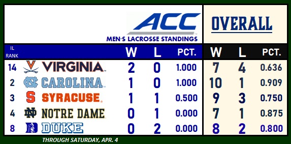 The Cavaliers play their second and final ACC road game at No. 3 Syracuse next Saturday. Opening faceoff from the JMA Wireless Dome is scheduled for 4 p.m. on ESPNU. The Orange fell, 14-9, at No. 2 North Carolina Saturday afternoon. The loss snapped Cuse’s seven-game winning streak, which was the fourth-longest among all Division I teams entering Saturday.