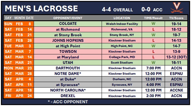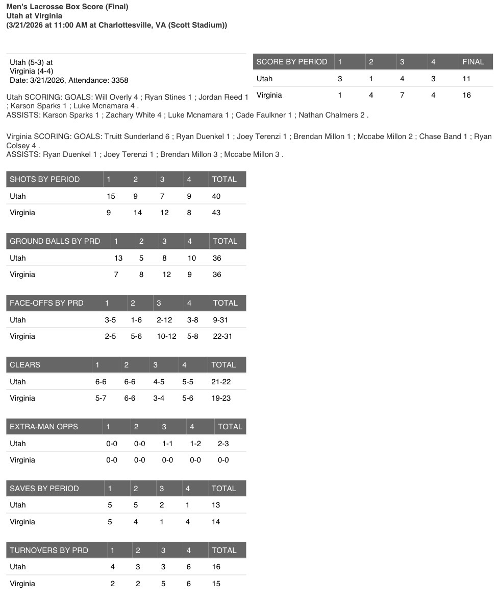 With the help of Greenspan, the Hoos (4-4) won 22 of the game’s 31 total faceoffs. UVA starting goaltender Jake Marek (3-3) finished with a season-high 14 saves. In addition to Sunderland, the Cavaliers were led on offense by McCabe Millon (2g, 3a), Ryan Colsey (4g) and Brendan Millon (1g, 3a). Defensively, John Schroter held his primary matchup and Utah’s leading scorer Ryan Stines (1g) to only one point, a season low. Stines entered Saturday’s game ninth among all Division I players in goals per game (3.29).