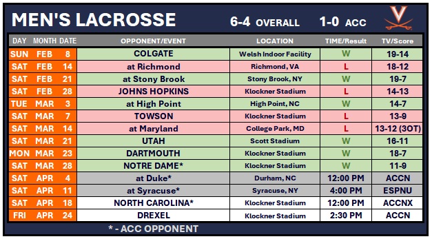 The Cavaliers travel to No. 4 Duke (8-1, 0-1 ACC) for its ACC road opener. Opening faceoff is scheduled for noon on ACC Network.