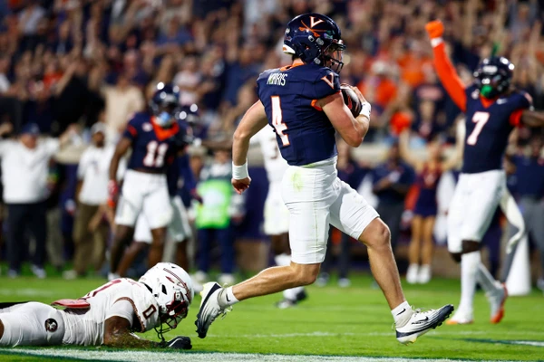 From there, Morris took it in, making a mad dash for the right side of the end zone’s pylon. By rule, UVA had to go for a 2-point conversion attempt and he found Trell Harris, who got behind cornerback Jerry Wilson for the 8-point lead, 46-38.