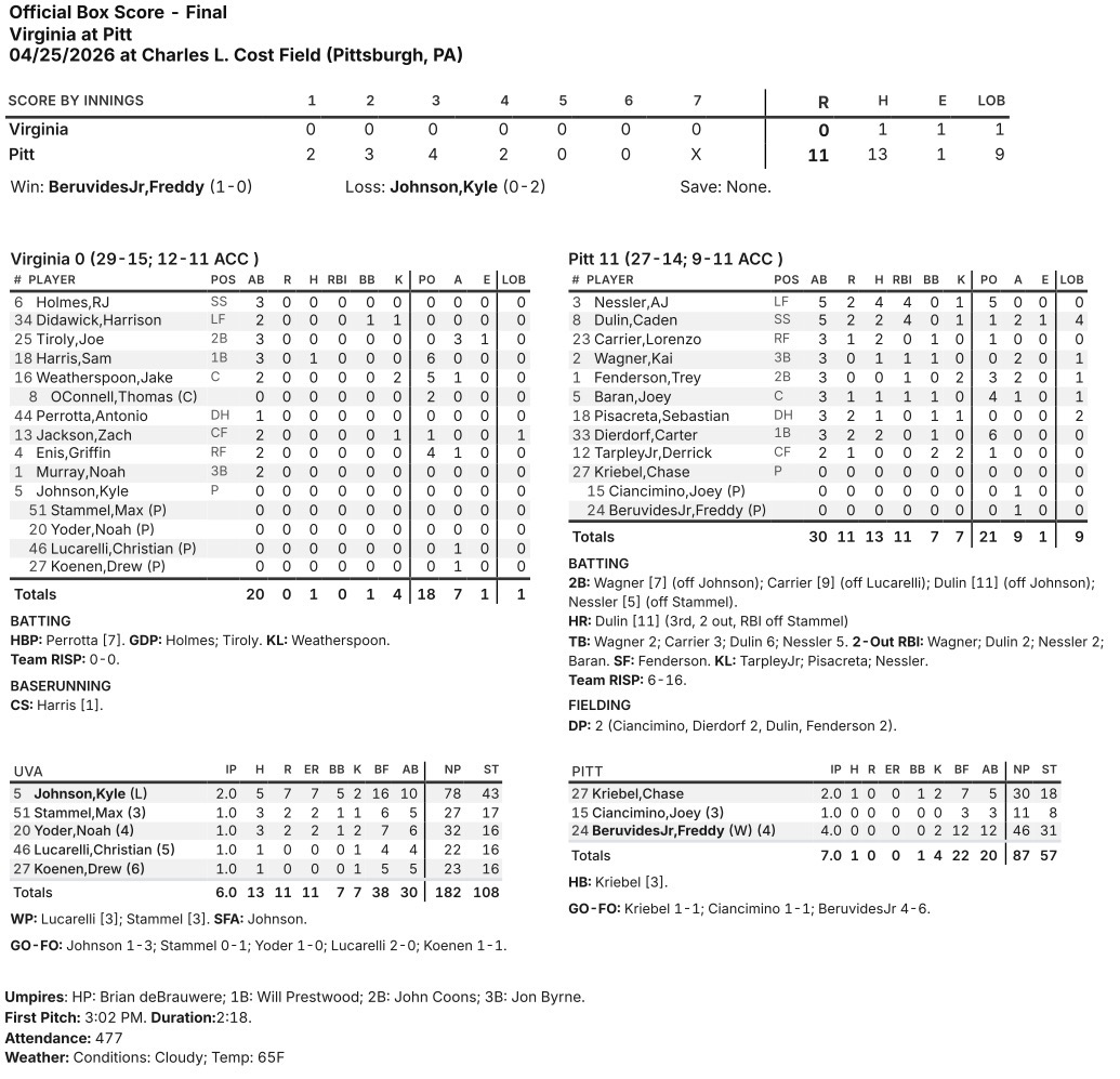 The No. 10 Virginia baseball team was run-ruled, 11-0, in seven innings on Saturday by Pitt at Charles L. Cost Field in the Steel City.