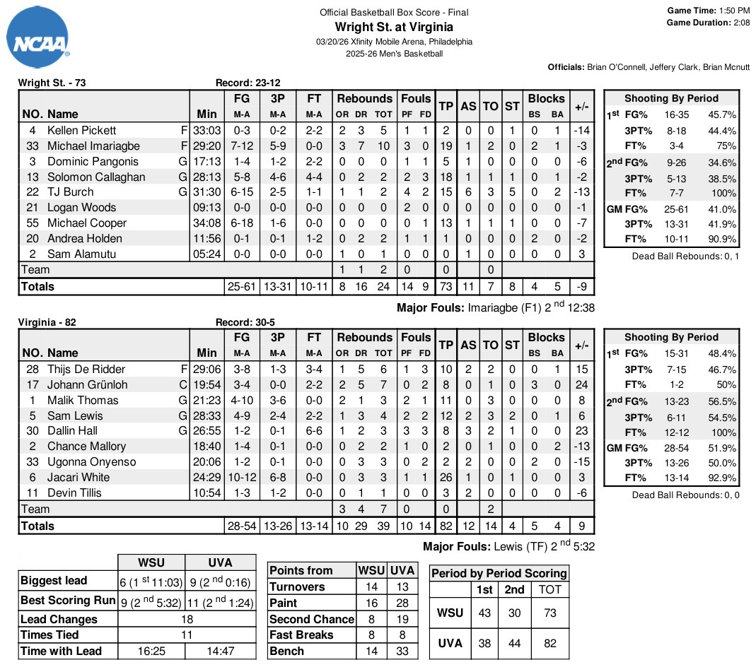 It was a back-and-forth affair all afternoon that featured 11 ties and 18 lead changes. Wright State — which had only won a First Four contest in 2022 in its tournament history — led for 41 percent of the day, compared to 37 percent for the Hoos.