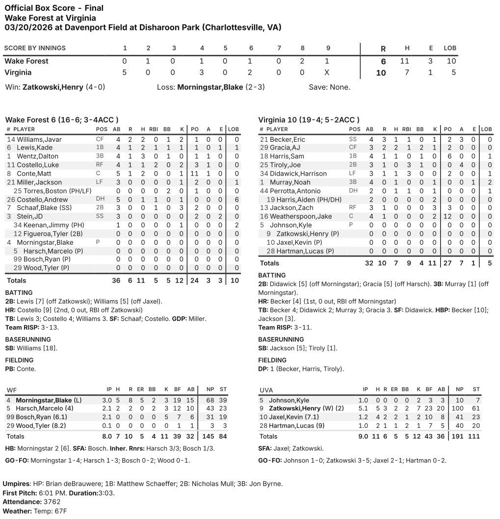 Wake Forest (16-6, 3-4 ACC) got a run back in the top of the second with a solo home run from Luke Costello. The Demon Deacons scratched across another run in the top of the fourth when Kade Lewis scored from second on a UVA error.