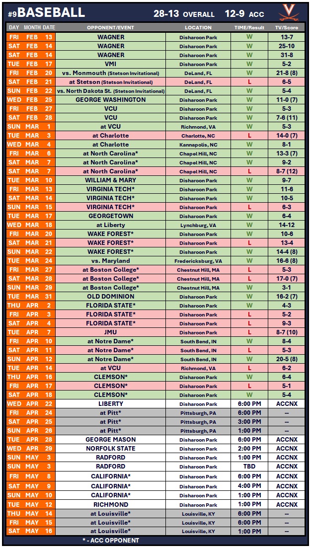 No. 9 Virginia will close out the mid-April homestand on Wednesday as the Cavaliers welcome Liberty to Disharoon Park. ACCNX and WINA (98.9/1070 AM) will carry the contest that is slated for a 6 p.m. first pitch.
