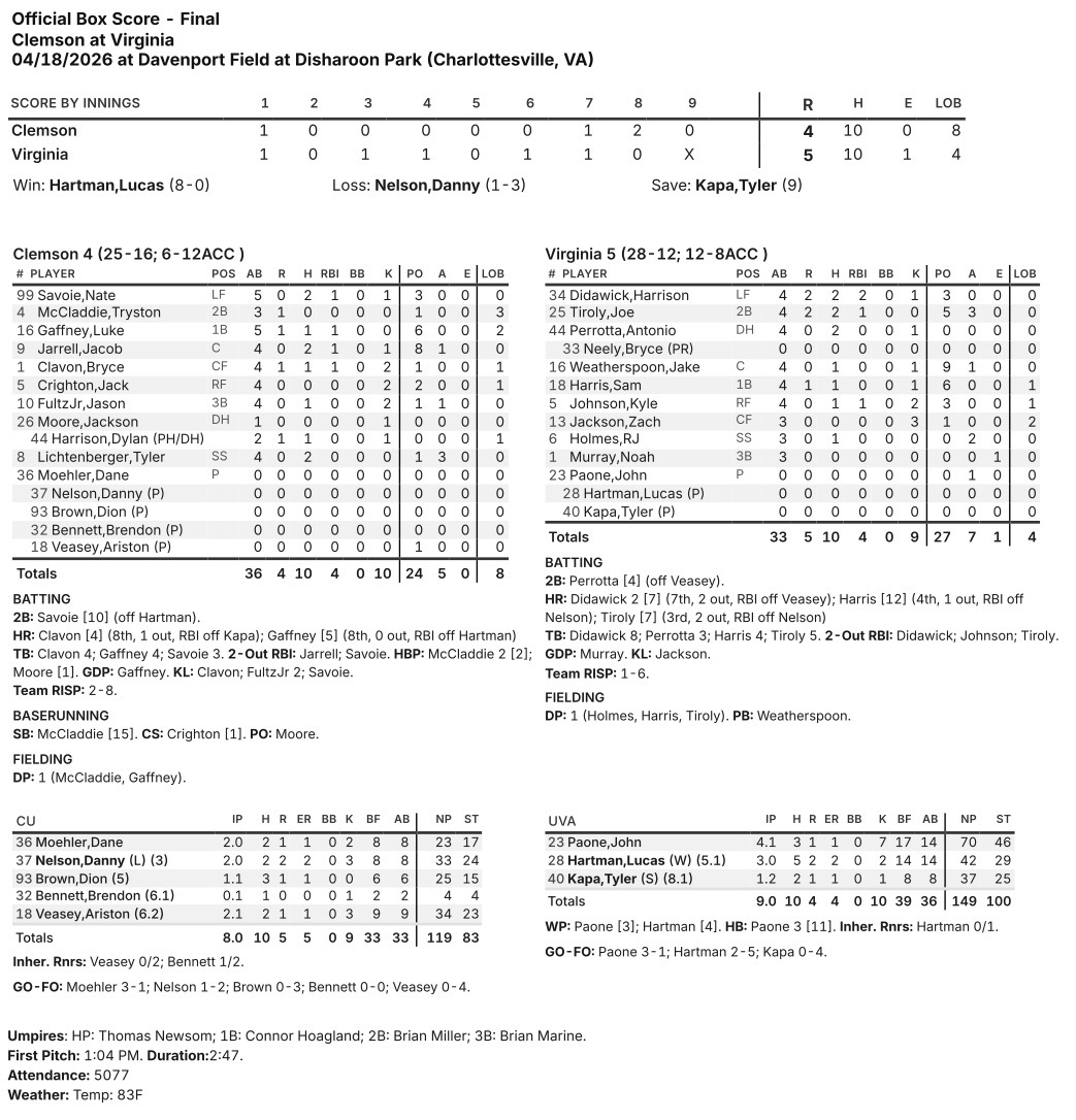On a day when the No. 9 Virginia baseball team was without AJ Gracia and Eric Becker, the Cavaliers outlasted Clemson, 5-4, at Disharoon Park on Saturday to seal the weekend series.