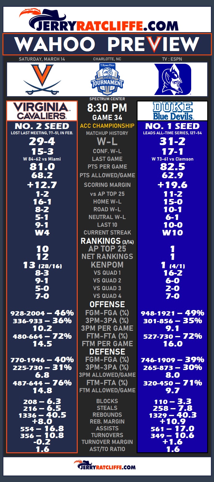 While Duke is the odds-on favorite to win, there is some question about whether the Blue Devils being down a couple of players might have difficulty playing against Virginia’s depth. Odom, who said that has been a big key to the Cavaliers’ season, normally plays nine players because of the physical demands of his system.