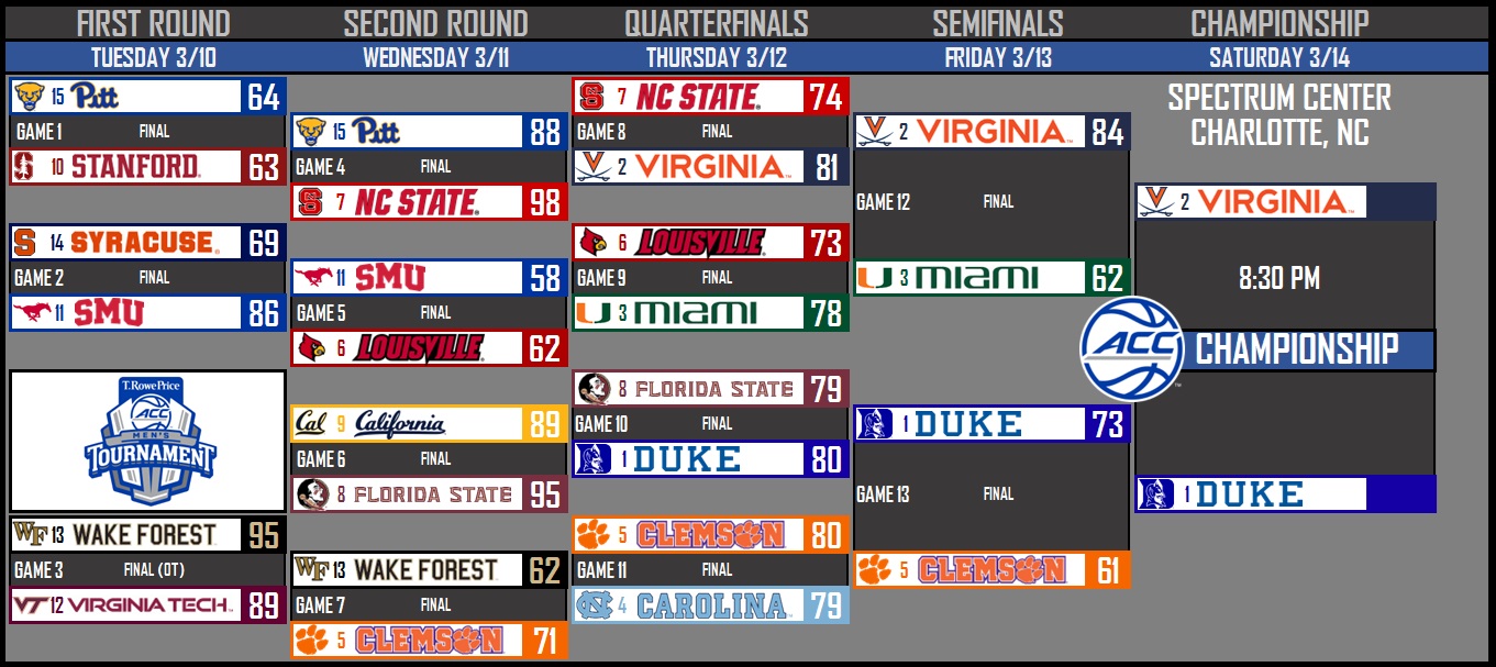 The mighty Blue Devils, minus a couple of key contributors, polished off Clemson to set up tonight’s ACC Tournament championship game at the Spectrum Center. Duke, one of the nation’s top teams since the beginning of the season, was expected to be here.