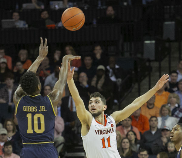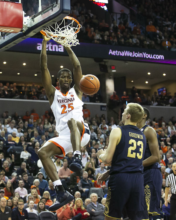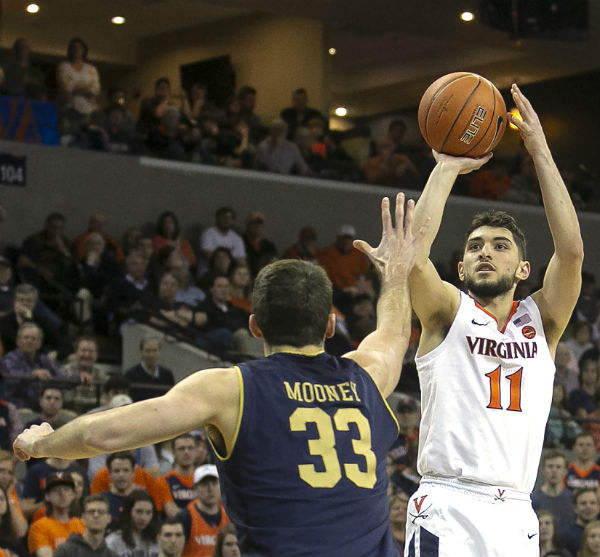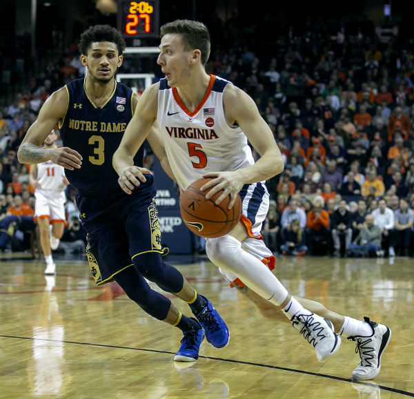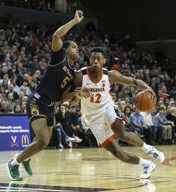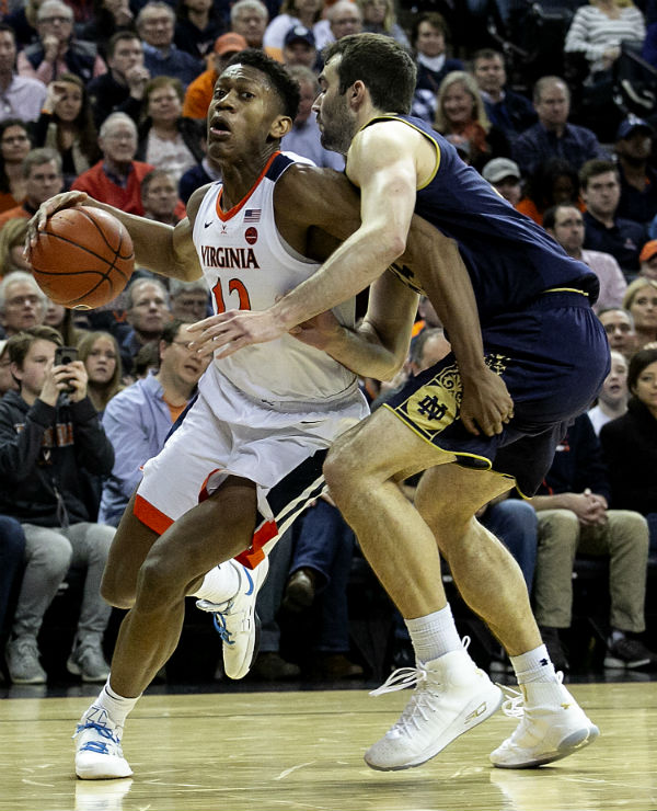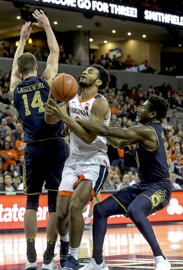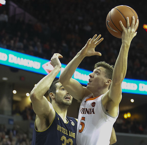 Photo Gallery: #4 Virginia Defeats Notre Dame Photo Gallery by John Markon from Virginia’s 60-54 win over Notre Dame. Kyle Guy, who led Virginia with 22 points, sinks an early layup against Notre Dame’s 6-9 John Mooney. Virginia’s cheerleaders grab some air time during a first-half timeout. Ty Jerome squeezes off a jumpshot over Notre Dame’s John Mooney. Virginia’s Braxton Key slides in between Notre Dame defenders Nate Laszewski (left) and T.J. Gibbs, Kyle Guy takes it inside against Irish defender Prentiss Hubb. Virginia’s lunging Ty Jerome menaces a shot by Notre Dame’s T.J. Gibbs. Mamadi Diakite’s second-half dunk boosted Virginia into a 39-30 lead. De’Andre Hunter, who scored 20 points, drives against Notre Dame’s D.J. Harvey earlier this season. U.Va.’s De’Andre Hunter draws a foul from Fighting Irish center John Mooney.