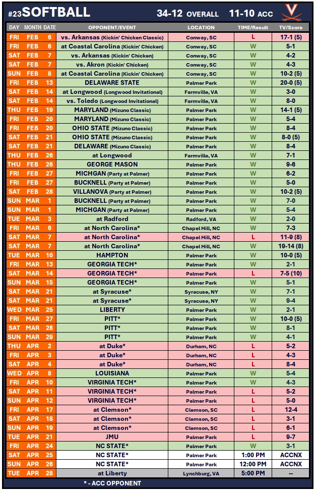 Virginia (34-12, 11-10) responded to tie things in the fourth inning when Kelsey Hackett laced a single down the third base line to score Macee Eaton from second. Eaton reached on a leadoff double to center.