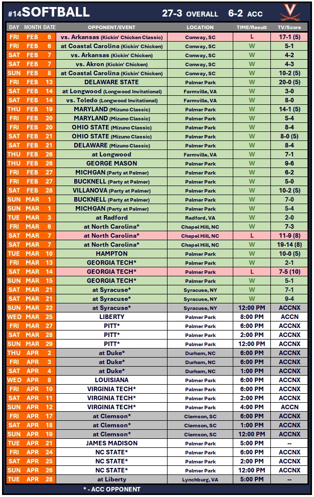 Virginia (27-3, 6-2 ACC) won the first game of the day 7-1 before taking the second game 9-4.