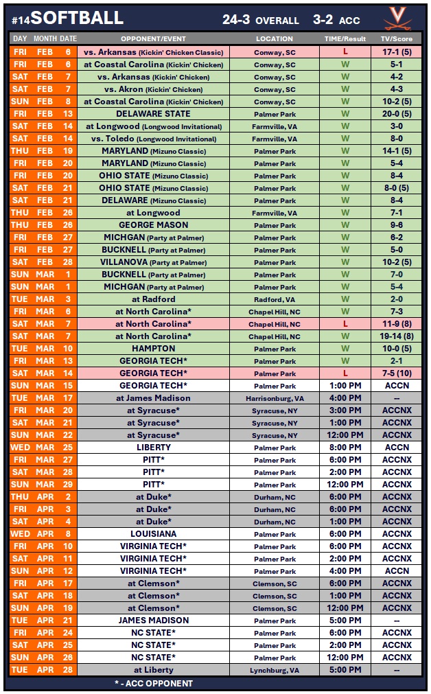 Virginia and Georgia Tech conclude the weekend series on Sunday. First pitch is set for 1 p.m. on ACC Network. It is fan appreciation day at the park with free rally towels given out while supplies last. Admission is free to the public.