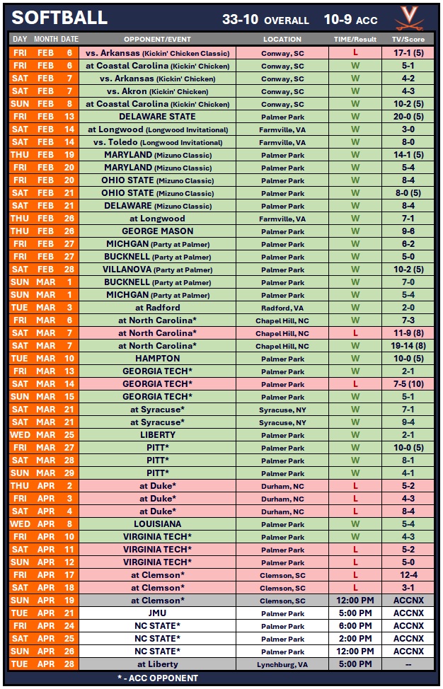 Virginia (33-10, 10-9) responded in the seventh, putting two on before Bella Cabral delivered a double to right field to get the Cavaliers on the board. The Tigers got out of the inning, however, locking up the win in game two of the series.