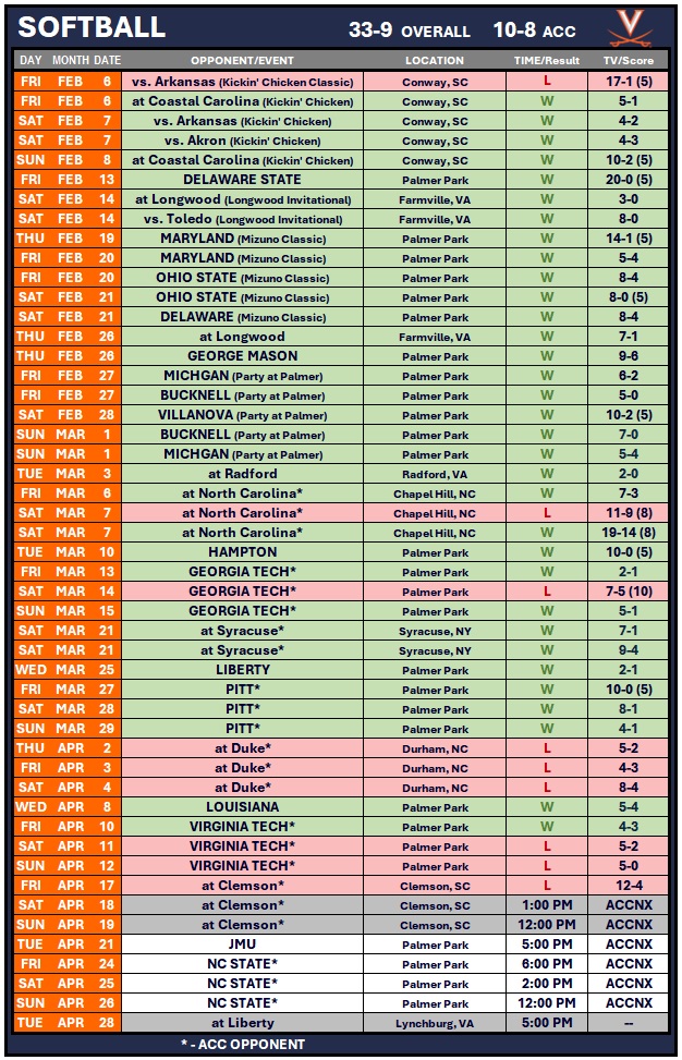 Virginia (33-9, 10-8 ACC) answered in the fifth, using an RBI single from Macee Eaton and a three-run home run from Bella Cabral to knot the score at four. Clemson, however, answered with a three-run home run of its own in the home half to move out to a 7-4 lead.