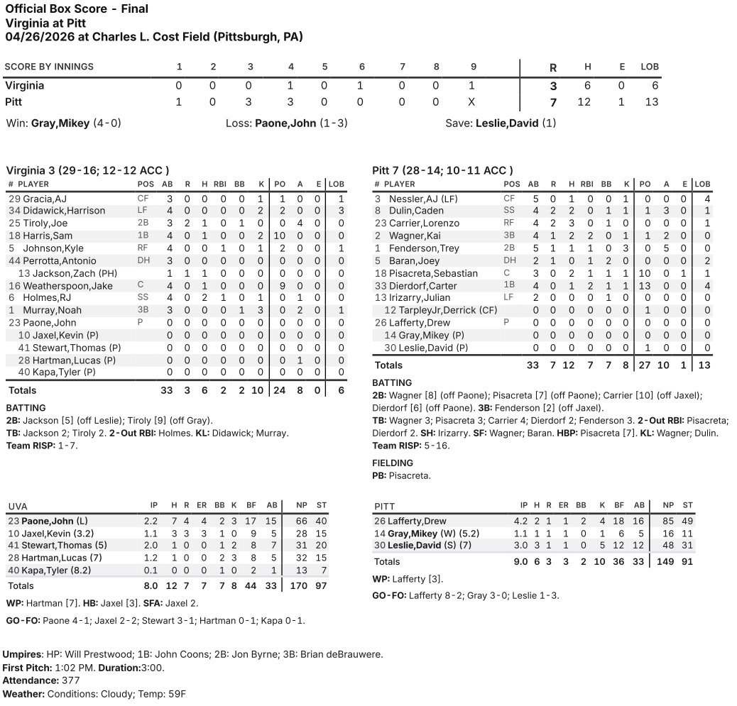 The No. 10 Virginia baseball team dropped a 7-3 contest on Sunday afternoon to Pitt at Charles L. Cost Field in Pittsburgh.