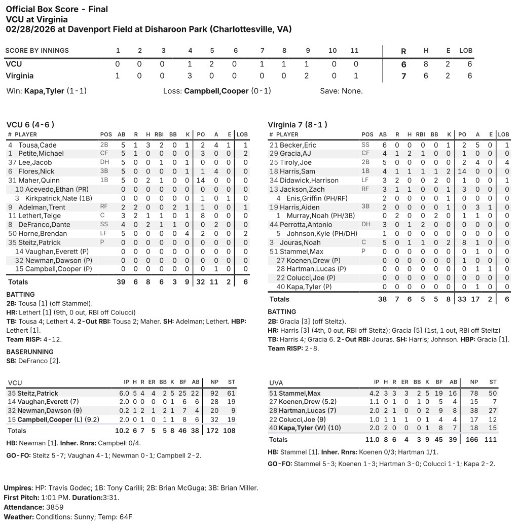 After forcing extras by scoring a pair of two-out runs in the ninth, Noah Murray scored the winning run in the 11th on a VCU fielding error. Virginia’s Tyler Kapa picked up the victory for the Cavaliers.