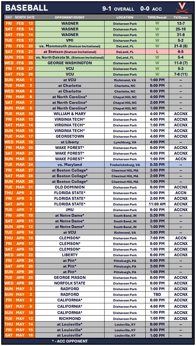 - Head Coach Chris Pollard matches Brian O’Connor’s 9-1 start in 2004 for the best start in a UVA head coaching tenure in program history.
