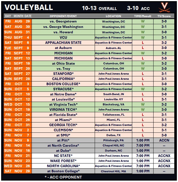 Reagan Ennist tallied a match-high nine kills and had eight digs on the evening. At the net, Jasmine Robinson and Caroline Lang each collected a team-best three blocks. Zoey Dood led UVA with 15 assists and nine digs in the match.