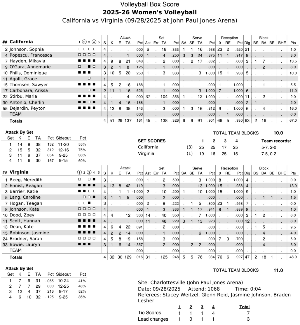 Set 1: Cal 25, Virginia 19
