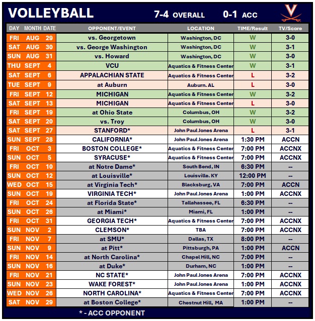 In the opening match of ACC play, the Virginia volleyball team fell in four sets (15-25, 14-25, 25-22, 17-25) to No. 3 Stanford on Saturday afternoon at John Paul Jones Arena.