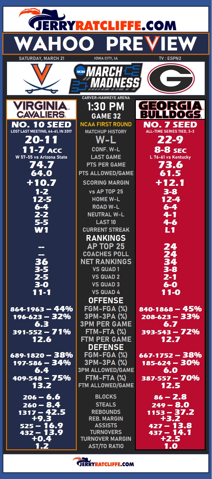 The 10th-seeded Virginia women’s basketball team (20-11) is set to take on seventh-seeded Georgia (22-9) in the first round of the 2026 NCAA Division I Women’s Basketball Championship on Saturday. Tipoff from Carver-Hawkeye Arena is set for 1:30 p.m. ET on ESPN2.