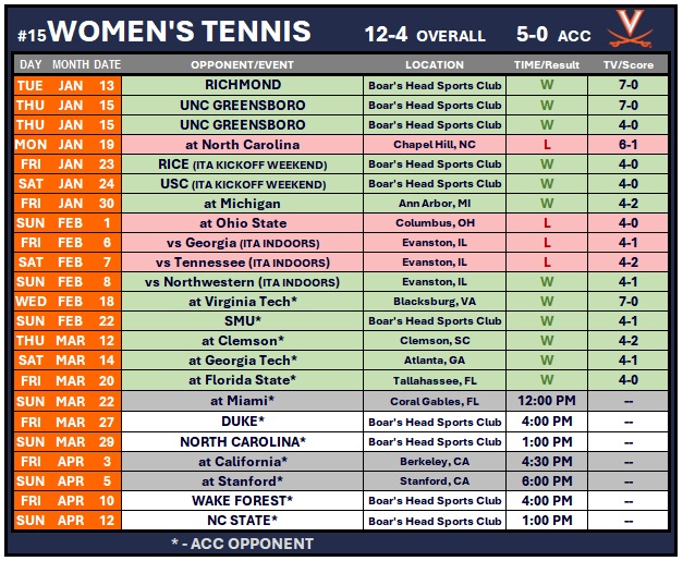The No. 15 Virginia women’s tennis team notched a 4-0 win at Florida State on Friday at the Scott Speicher Memorial Tennis Center in Tallahassee.